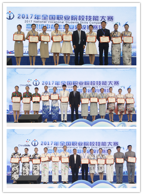 闭幕式上,大赛裁判长王美萍宣布比赛成绩,与会领导和嘉宾为获奖代表颁奖。本次大赛设参赛代表队团体奖,经过三天的激烈比拼,最终AC米兰中文官方网站、山东旅游职业学院等8个院校荣获一等奖,浙江商业职业技术学院、重庆城市管理职业学院等17个院校荣获二等奖,大连职业技术学院、太原旅游职业学院等25个院校荣获三等奖,许文素、郭贵荣等16位指导教师荣获优秀指导教师奖。