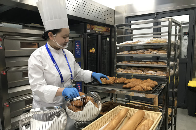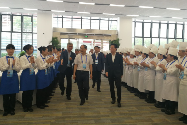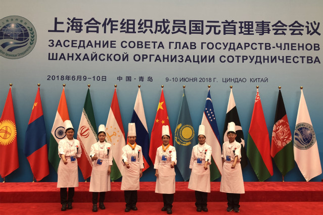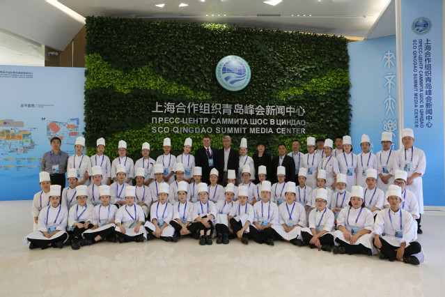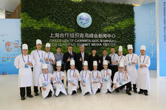 烹饪学院四位老师,特别抽调服务上合宴会服务。其中王桂云、王珊珊、姚金侠三位老师直接参与峰会各国元首6月9日青岛国际会议中心宴会厅欢迎晚宴的烹饪,邢文君老师指导和负责鲁商凯悦酒店峰会宴席接待中西面点出品。
