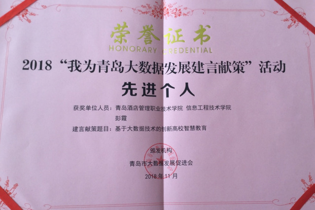 本网讯(信息工程技术学院 彭霞)11月2日,2018青岛市大数据专家大会暨大数据秋季论坛在青岛贵都国家大饭店召开,信息工程技术学院彭霞荣获“青岛大数据建言献策先进个人”荣誉称号,其论文《网页文本内容情感挖掘》入围“2018青岛市优秀大数据学术成果”。