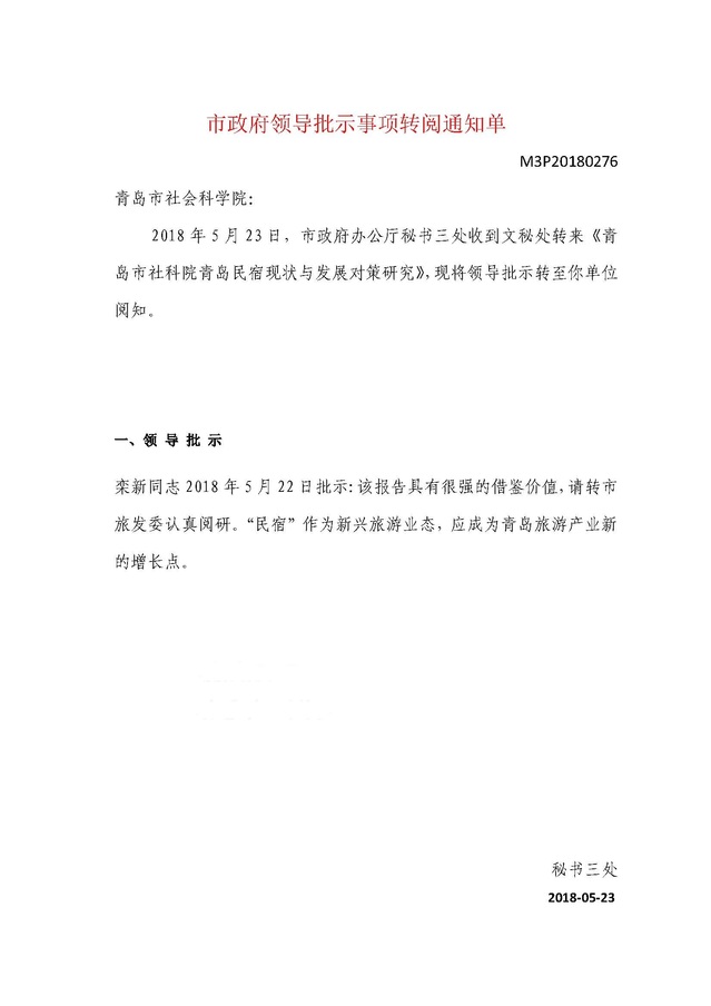 本网讯(科研发展处 魏有广)近日,从青岛市社科联传来消息,我院主持的青岛市“双百调研工程”课题“青岛民宿现状与发展对策研究”的研究报告分别获青岛市副市长栾新同志、青岛市原常务副市长王鲁明同志的肯定性批示,并由市政府办公厅转发市城乡建设委员会、市规划局、市社会科学院等部门研究阅办。