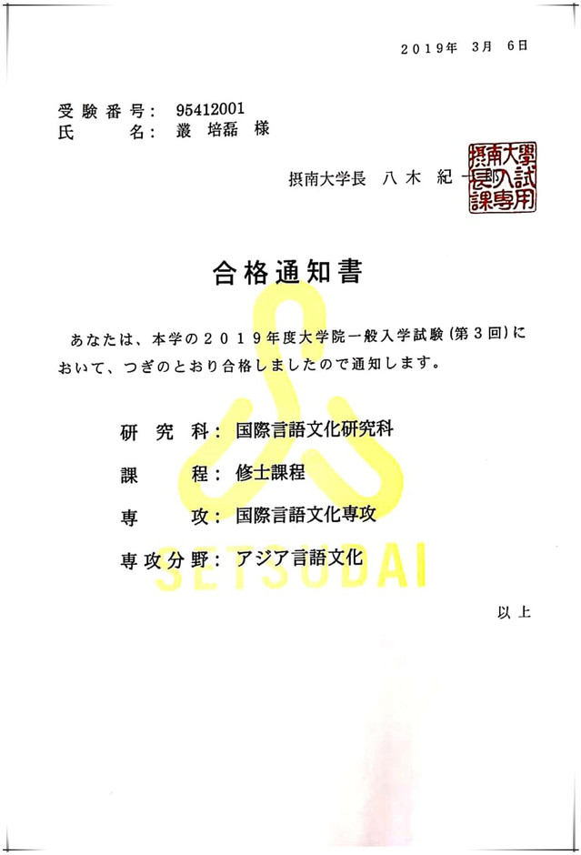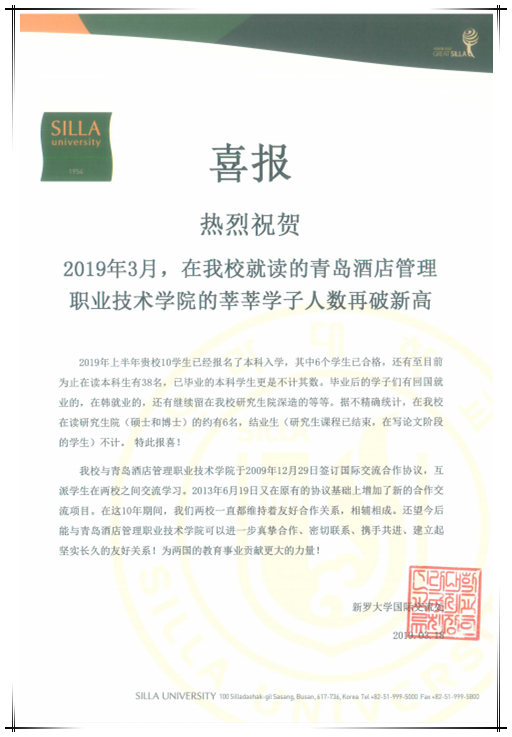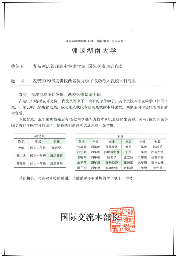 本网讯(国际交流与合作处 邵常恩)近日,学院陆续接到韩国新罗大学、韩国湖南大学、日本京都西山短期大学等国外合作院校发来的喜报,2019年春季学期共有2015级旅游与酒店管理学院邹云帆等11名我院学子顺利通过专升本,进入到本科学习阶段,另有2012级旅游与酒店管理学院丛培磊等3名我院学子进入到硕士研究生学习阶段。