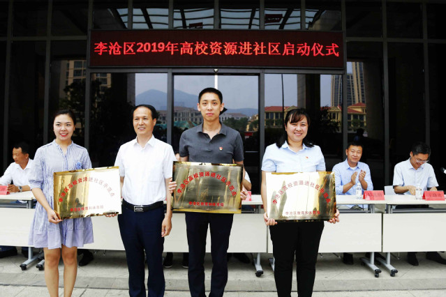 启动仪式上,李沧区区委常委、宣传部长、教育工委书记郑海涛为我院和山东外贸职业学院颁授李沧区社区教育学院分院的标牌。王建宝向九水街道延川路社区、浮山路街道浮山路社区、世园街道上流佳苑社区颁授高校资源进社区示范点的标牌。