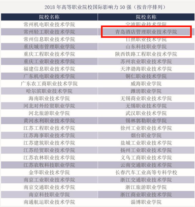 《2019中国高等职业教育质量年度报告》是受全国高职高专校长联席会议委托,由上海市教育科学研究院和麦可思研究院共同编制的,学院继2017年之后,再次入围“国际影响力50强”,这是对学院国际化工作成效的充分肯定。《报告》较大幅度优化了指标,更加注重教学内涵建设的国际影响力,更加强调专业课程标准水平、国(境)外服务与影响。