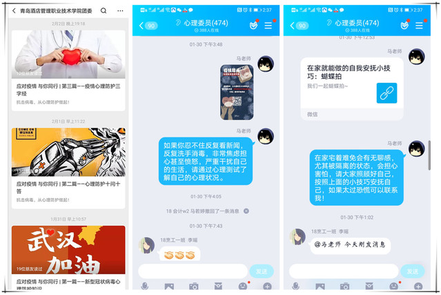 本网讯(团委 徐豪杰)新型冠状病毒感染的肺炎疫情发生以来,根据学院党委工作安排,团委迅速响应,精心组织,及时开通了网络心理援助服务,帮助全体师生做好疫情防控期间的心理防护,克服过度焦虑、恐慌等负面情绪,保持健康、积极、乐观的良好心态。