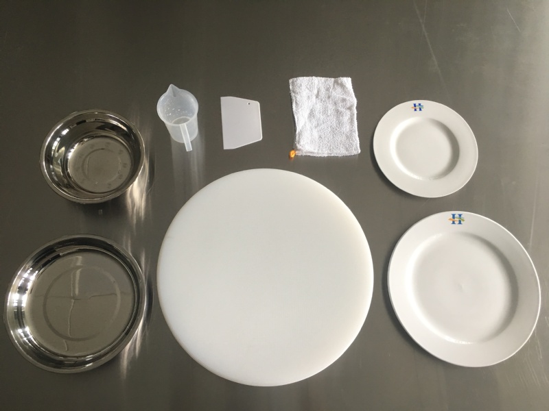 1.设备及工具:水池、不锈钢操作台、圆形聚酯砧板1个、不锈钢盘1个、不锈钢碗1个、量杯1个、白毛巾1条、刮板1个、直径为23厘米的圆平盘1个、直径为30厘米的圆平盘1个;
