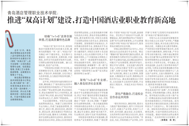 “山东是职业教育创新发展高地,青岛是高地中的‘高峰’。作为省属驻青高校,学院将继续融入青岛、服务青岛,使学院成为支撑山东省十强产业之一的精品旅游业加速发展的高素质技术技能型酒店人才培养高地,成为促进青岛市建设国际旅游之都的酒店科技生产力促进中心,努力建设国内一流、国际知名的酒店业全科型职业教育品牌,打造中国酒店业职业化人才的摇篮,建成中国酒店业职业教育新高地。”在谈到学院今后发展时,李达如是说。 (郭菁荔 陈 赞)