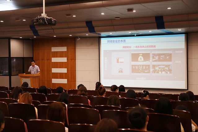 王震围绕为什么需要网络安全、网络安全态势、网络安全法律法规、网络安全意识及风险防范这四个部分,对如何提高网络安全意识进行了详细阐述。同时,结合国家网络安全宣传周“网络安全为人民,网络安全靠人民”的主题,王震列举了和同学们生活息息相关的大量案例,使学生对网络风险有了更具体地认识,掌握了防范风险的具体办法,加强了安全防范意识。