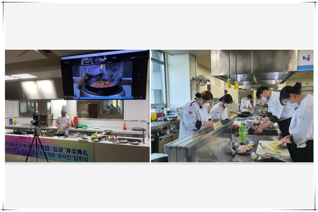 本网讯(国际交流与合作处 孙丽艳)9月21日中午,2020年韩国彗田大学中国烹饪项目——中国鲁菜网络教学“云端”开学典礼在烹饪学院中餐实训室举行。