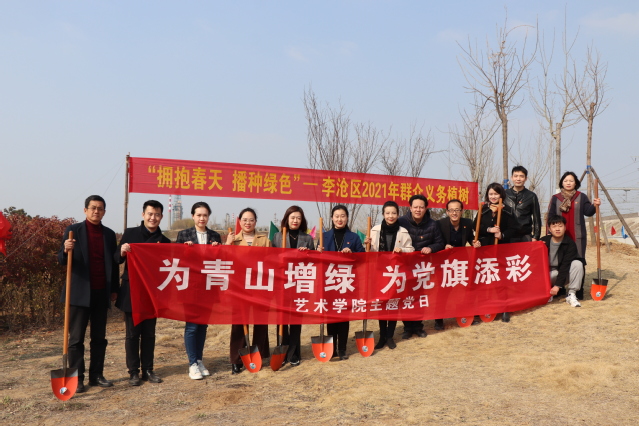 本网讯(艺术学院 于友鹏) 3月12日下午,艺术学院党总支“为青山增绿,为党旗添彩”主题党日暨义务植树活动在李沧区环湾路东侧开阔空地举行。艺术学院教职工党员和学生入党积极分子代表参加了活动。