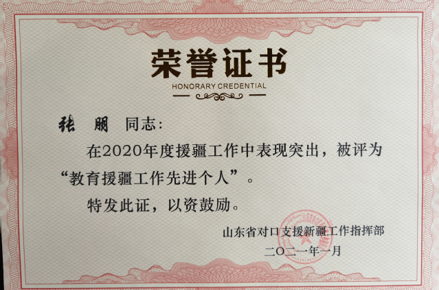 张朋用实际行动展现了山东援疆专家良好的精神风貌,展现了我院教师的扎实作风和家国情怀,受到了当地广大干部群众的认可和高度赞扬,其工作成绩多次被山东、新疆两地院校新闻媒体报道。2021年1月,张朋被山东省对口支援新疆工作指挥部光荣授予“教育援疆工作先进个人”荣誉称号。