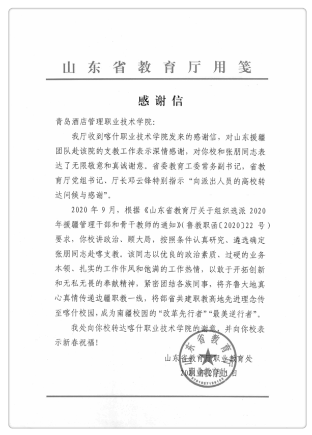 山东省教育厅发来感谢信称赞学院援疆工作