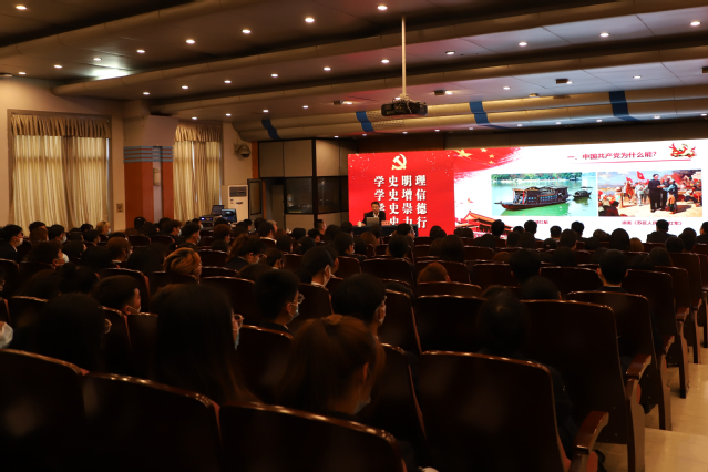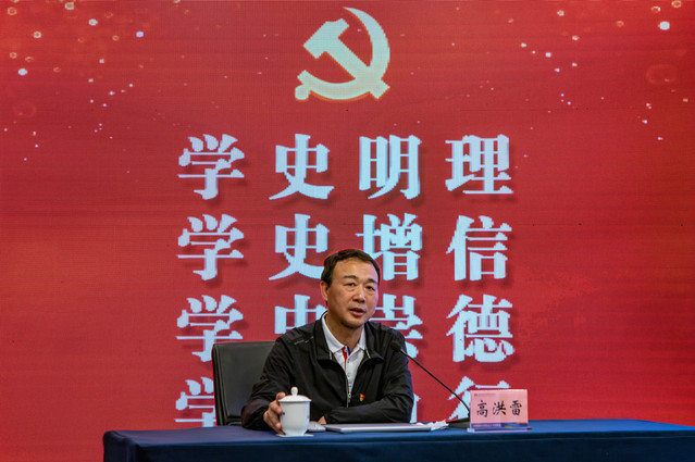 高洪雷结合党史故事,通过重大事件、重要人物回顾了中国共产党百年奋斗的光辉历程和历史性贡献,诠释了共产党人的革命理想和初心使命。他表示,一要弄清楚中国共产党为什么“能”。二要弄清楚中国特色社会主义为什么“好”。历史和实践证明,只有社会主义才能救中国,只有中国特色社会主义才能发展中国。三要弄清楚“为什么讲团结统一”。增强“四个意识”,坚定“四个自信”,做到“两个维护”,是我们党和国家从胜利走向胜利的重要保证。四要弄清楚“为什么要保持纯洁”。要拧紧总开关,划好人生底线,做到慎独、慎初。五要弄清楚“为什么要有精神”。人有了精神,就有了追求,有了动力,有了灵魂,有了脊梁骨,就有骨气、志气、勇气;没有精神,就没有追求,就会失去动力,就等于得了软骨病,缺什么都不能缺精神。