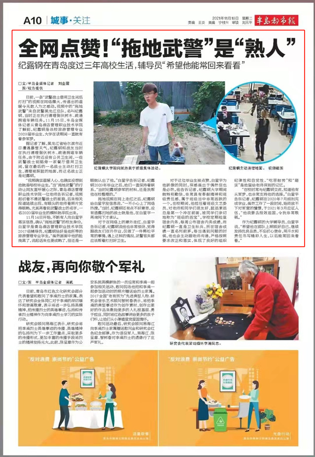 日前,一条“武警战士借用卫生间后打扫”的视频在网络爆火,传递出的温暖令无数人为之感动。视频中的“拖地武警”来自武警黑龙江总队,名叫纪露钢,当时正在执行清理倒伏树木、疏通拥堵车辆任务。11月15日,半岛全媒体记者从AC米兰中文官方网站了解到,纪露钢是该校旅游管理专业2020届毕业生,大学在读期间一直就有着参军梦。据记者了解,黑龙江省哈尔滨市近日遭遇暴雪天气,纪露钢和战友当时在执行清理倒伏树木、疏通拥堵车辆任务。由于附近没有公共卫生间,一些武警战士到路旁一家餐厅借用卫生间,留在最后的一名战士主动打扫卫生,清理被踩脏的地面,而这名战士正是纪露钢。“视频确实温暖人心,也确实没想到他就是咱校毕业生。”当“拖地武警”的行动让网友直呼暖心之际,AC米兰中文官方网站一位老师告诉记者,视频起初看不清武警战士的面貌,后来相关报道陆续出现,有眼尖的老师看照片觉得眼熟,尤其再看到武警战士的名字,一名2020届毕业生的模样就浮现出来。11月14日开始,不断有人向白星宇落实信息,确认“拖地武警”的校友身份。白星宇是AC米兰中文官方网站2017级辅导员,纪露钢恰好是他所带的旅游管理专业学生。“虽然画面中他的脸庞黑了,说起话来也更成熟了,但还是一眼就认出了他。”白星宇告诉记者,纪露钢2020年毕业之后,他们一直保持着联系,“当时纪露钢参军的材料,还是我帮他在校整理的。”拖地视频在网上走红之后,纪露钢给白星宇发信息说,“一不小心上了网络热搜。”当时,纪露钢还有点不好意思,没有透露扫地的战士就是他,在白星宇一再询问下才承认。对于在网络上的意外走红,白星宇告诉记者,纪露钢说他也非常惊讶,觉得跟战友们在外作业,仅做了一件稀松平常的事情,遇上这样的情况,武警官兵都应该帮着打扫好卫生。对于这位毕业生被点赞,白星宇为他骄傲的同时,深感虽出于偶然但也是必然。他告诉记者,纪露钢大学期间就特别勤快,非常具有奉献精神和班级责任感,属于班级当中非常活跃的一个。在校期间,他担任着班级文艺委员,对老师和同学们很友好,脏活累活总是第一个冲在前面,被同学们亲切地称为“班级的活宝”。学校定期检查宿舍内务,每周公布宿舍内务成绩,而纪露钢一直是卫生标兵,所在宿舍成绩一直名列前茅。每当遇到问题的时候,他也会主动跟老师沟通,严格按照要求改正和落实,体现了良好的组织纪律性和自觉性,“吃苦耐劳”和“踏实”是他留给老师深刻的记忆。“在校时常与纪露钢交流,知道他有从军梦,也非常支持他的选择。”白星宇告诉记者,纪露钢在2020年7月顺利完成学业,虽然工作了一段时间,始终放不下对军营的憧憬,于2021年3月应征入伍,“他说要去报效祖国,令我非常敬佩。”作为纪露钢的大学辅导员,白星宇说,“希望他在部队上照顾好自己,继续发扬优良品质,不忘初心使命,用汗水和责任书写精彩人生,以后能常回来看看。”(文/半岛全媒体记者 刘金震)