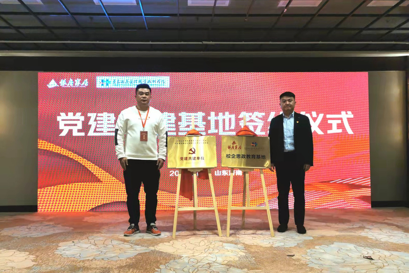 仪式上,双方共同签订党建共建合作协议,确立了“校企思政教育基地”建设计划。酒店工程学院党总支书记薛陆与山东银座家居有限公司综合管理部部长盖永磊共同为党建共建基地和校企思政教育基地揭牌。随后,双方分别就党建共建具体工作、党史学习教育开展情况和“我为群众办实事”实践活动等方面进行了座谈交流。