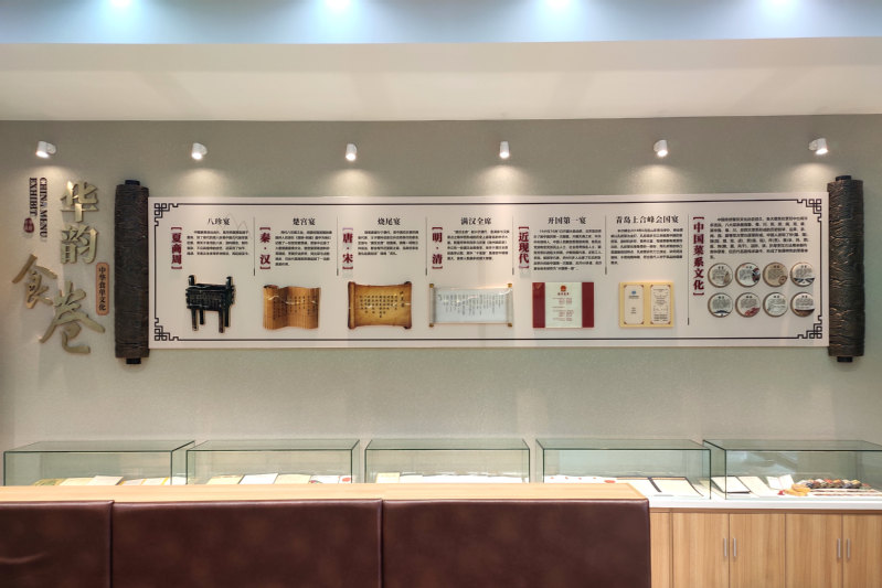 “华韵食卷”按照食单文化发展脉络,以卷轴形式展示了从夏朝至今四千多年中国食单文化的发展历程,选取各个朝代具有典型饮食文化韵味的名宴食单,展示中国宴席菜单的演变、八大菜系的风味流派特点,彰显了中华饮食文化多彩风韵。“华韵食卷”下方设立专柜,陈列展示了新中国成立以来国家领导人宴请外宾菜单实物、全国各五星级酒店宴会菜单和餐饮百年老店传统菜单,充分展示了烹饪学院的专业文化特色。