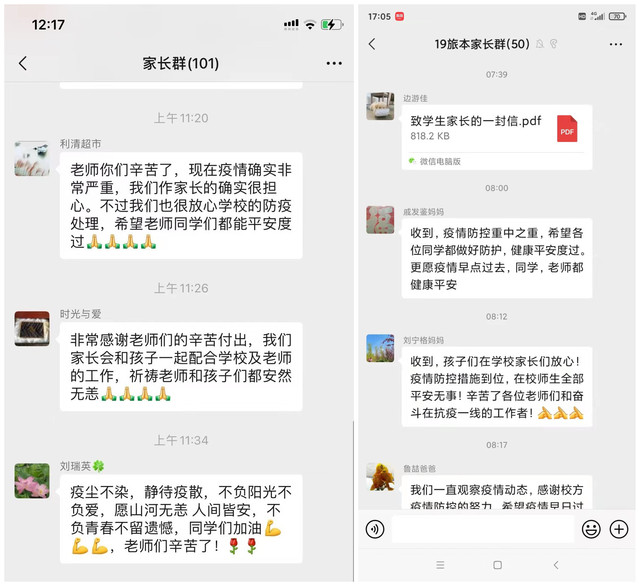 学校发布《致家长的一封信》通过辅导员转发给学生的家长,得到了广大家长朋友们的理解、信任和支持。惟其艰难,方显勇毅,在这样特殊的时期,选择勇毅与坚强,选择团结和担当,家校配合协同、携手共同筑牢学生的健康安全。