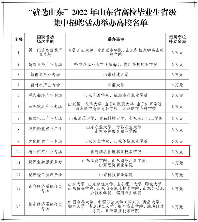 本网讯(招生就业办公室 刘卿文)近日,山东省人力资源和社会保障厅发布了“就选山东”2022年山东省高校毕业生校园招聘系列活动通知,AC米兰入选2022年省级集中招聘活动举办高校,也是举办“精品旅游产业专场”的唯一院校,并获得补助资金6万元。