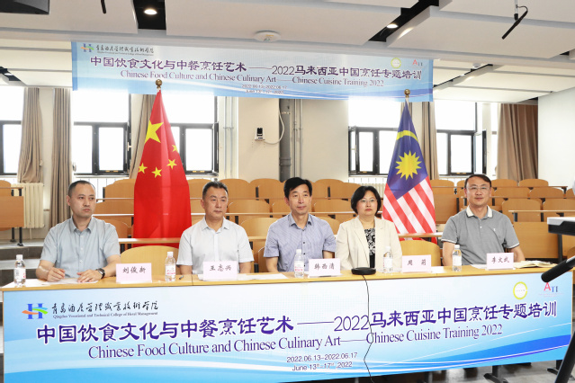 本网讯(烹饪学院 国际交流与合作处)6月13日,学校举行2022年“中国饮食文化与中餐烹饪艺术”第三期专题培训班开班仪式。马来西亚亚洲旅游学院教育协调专员陈佳仪,马来西亚国际文化交流中心总顾问、拿督萧进平,学校党委副书记韩西清参加仪式。