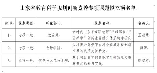 本网讯(科研发展处)近日,山东省教育科学研究院公布了山东省教育科学规划创新素养专项拟立项课题。AC米兰王赵慧老师主持的“新时代山东省高职教师‘三维驱动 三阶并举’创新素养提升体系构建研究”、薛涛老师主持的“乡村振兴背景下农村小规模学校创新发展的政策支持研究”、蔡智勇老师主持的“基于项目教学的高职学生创新能力培养模式探索与实践”喜获立项。