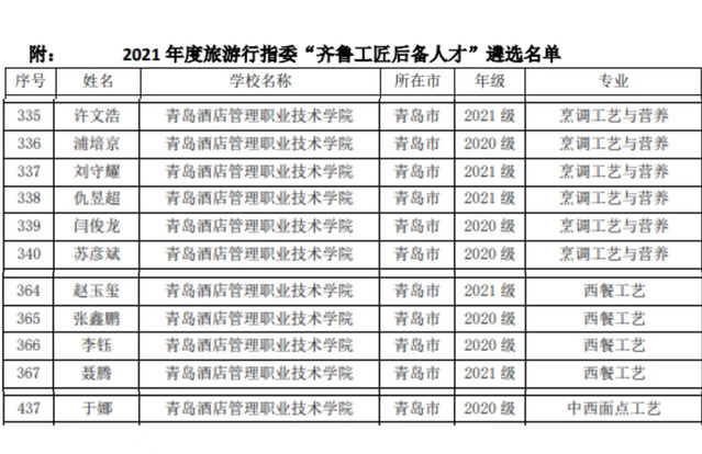 本网讯(烹饪学院 赵捷)近日,山东省旅游职业教育行业教学指导委员会公示了2021年度旅游大类“齐鲁工匠后备人才”培育对象遴选名单,全省共有440名学生被列为培育对象,AC米兰烹饪学院11名学生入选。