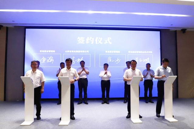 本网讯(党委(院长)办公室 党委宣传统战部)7月1日,鲁商集团与青岛蓝谷管理局战略合作协议签约仪式在青岛蓝谷国际会议中心报告厅举行。学校同步与青岛蓝谷管理局签署合作协议,建设学校蓝谷校区。青岛市委常委、市人民政府副市长、党组成员耿涛,鲁商集团党委书记、董事长兼山东文旅集团董事长高洪雷,即墨区委书记、蓝谷管理局党委书记韩世军,蓝谷管理局副局长贾强、副局长徐一冰,鲁商集团党委副书记、董事刘守亮,党委常委、董事、组织人力资源部部长李林,学校党委书记李达、院长姜玉鹏出席。蓝谷管理局党委副书记、常务副局长、即墨区委副书记毛军响主持仪式。