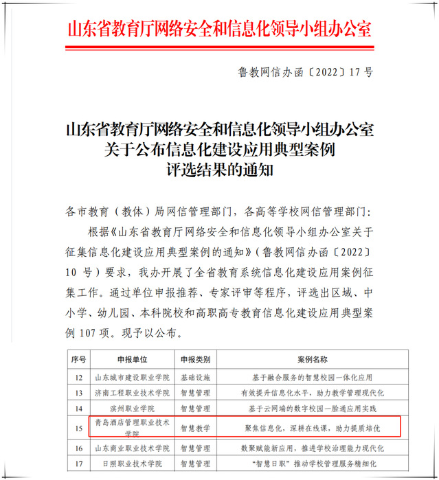 本网讯(教务处 教育信息中心)近日,山东省教育厅网络安全和信息化领导小组办公室下发了《关于公布信息化建设应用典型案例评选结果的通知》(鲁教网信办函〔2022〕17号),AC米兰报送的案例《聚焦信息化,深耕在线课,助力提质培优》入选。