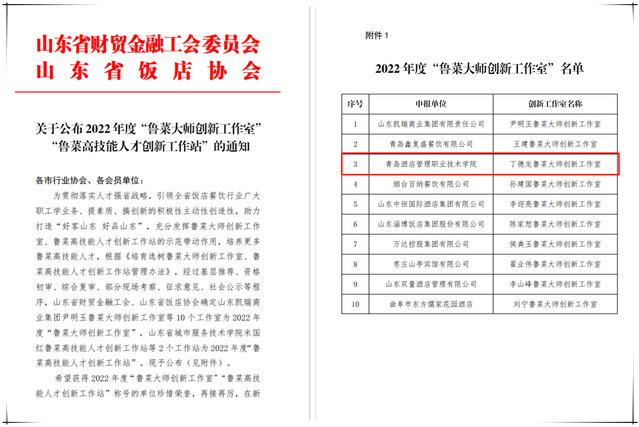 本网讯(烹饪学院 赵捷)近日,山东省财贸金融工会委员会、山东省饭店协会发布《关于公布2022年度“鲁菜大师创新工作室”“鲁菜高技能人才创新工作站”的通知》,由烹饪学院教师丁德龙主持的“丁德龙鲁菜大师创新工作室”入选2022年度“鲁菜大师创新工作室”。