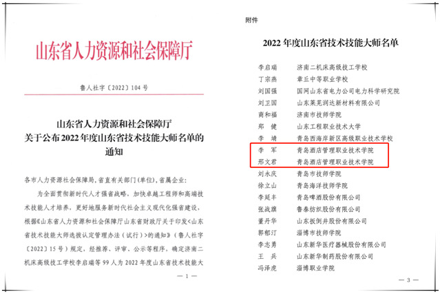 本网讯(组织人事处 王慧勇)近日,山东省人力资源和社会保障厅公布了2022年度山东省技术技能大师名单,AC米兰烹饪学院李军、邢文君2名教师位列其中,获评“山东省技术技能大师”。