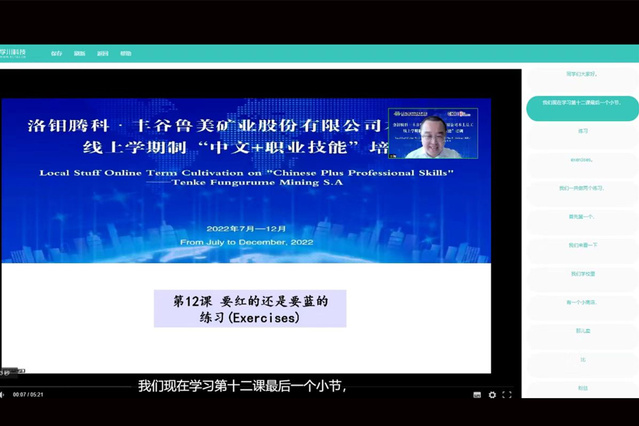 此次培训项目自今年7月启动,为期四个月。期间,在有色金属工业人才中心支持下,学校作为山东省教育厅遴选的中国海外职业技术学院47所参建院校之一,为刚果(金)洛钼腾科·丰谷鲁美矿业股份有限公司的企业员工进行线上学期制“中文+职业技能”培训。培训依托国际在线教育平台,采用“录播+直播”的混合方式进行中英双语授课,三位授课教师共完成录播课程18次、录制视频76个,共计76课时;分别进行直播课程4次。