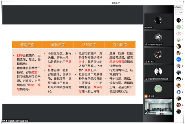 信息工程技术学院邀请学校大学生心理咨询中心马晓晴老师开展大学生自我心理防护线上主题讲座,帮助学生分析学习和生活中出现焦虑、紧张情绪的背后原因,并提出了科学有效的调节方法。同学们积极与老师进行沟通交流,表示将以积极的心态面对大学生活、走好人生之路。