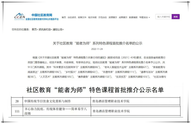 前期,学校根据省教育厅《关于转发教育部职成司<关于开展社区教育“能者为师”特色课程推介共享行动的通知>的通知》(鲁教民处函〔2021〕3号)要求,从校内社区教育数字化课程资源中遴选课程参加山东省评选,推介课程通过“山东终身学习在线”和“山东老年学习在线”等平台展示,并向教育部推荐。