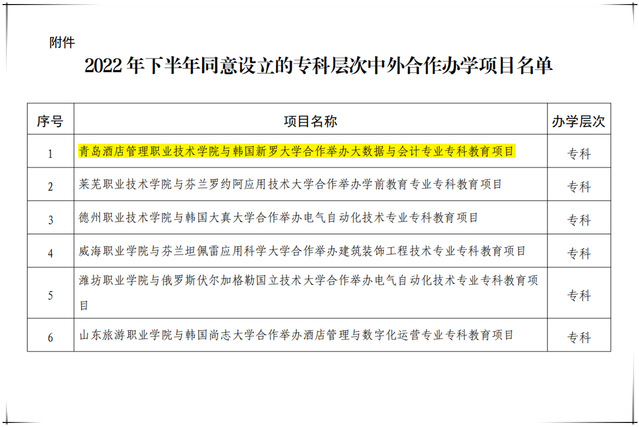本网讯(会计学院 国际交流与合作处)近日,山东省教育厅下发《关于公布2022年下半年专科层次中外合作办学项目的通知》(鲁教外函[2022]62号),学校与韩国新罗大学合作举办的大数据与会计专业专科教育项目以第一名的成绩通过评审。