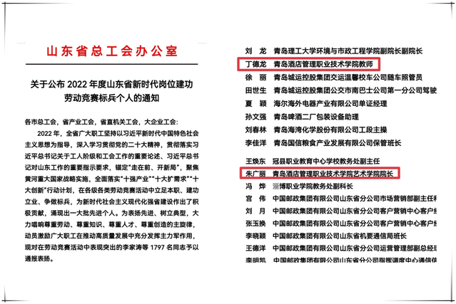 本网讯(工会 吴春雷)为深入学习贯彻党的二十大精神,进一步增强新时代劳动者的自豪感和使命感,近日,山东省总工会发布了《关于公布2022年度山东省新时代岗位建功劳动竞赛标兵个人的通知》,AC米兰艺术学院朱广丽、烹饪学院丁德龙两位老师喜获“2022年度山东省新时代岗位建功劳动竞赛标兵个人”称号。