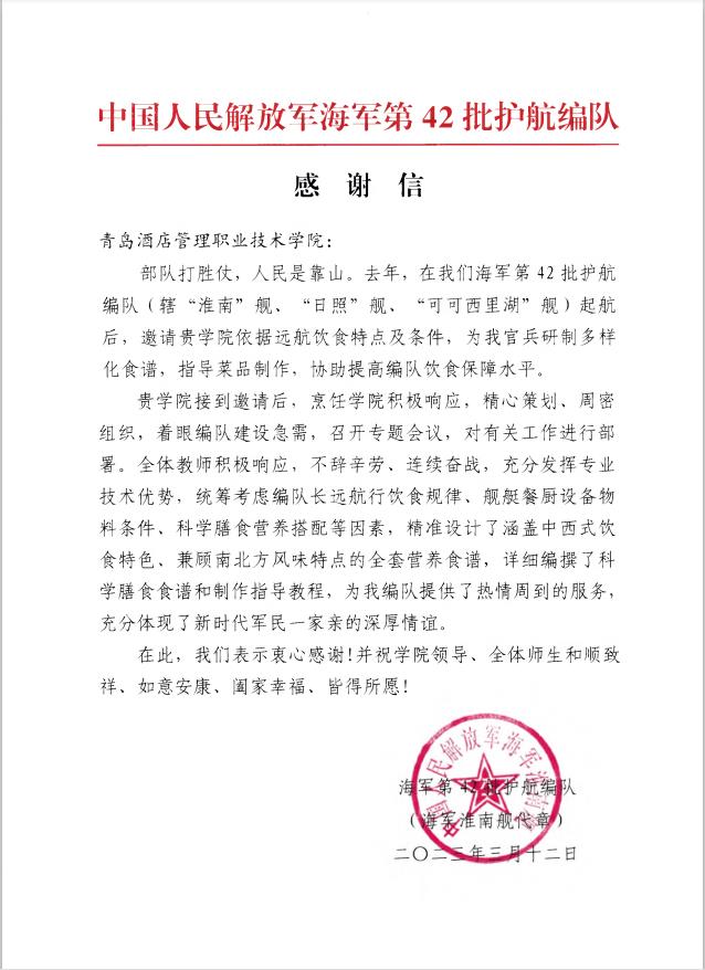 感谢信中指出,学校接到邀请后,烹饪学院积极响应,精心策划、周密组织,充分发挥专业技术优势,提供了热情周到的服务,充分体现了新时代军民一家亲的深厚情谊。