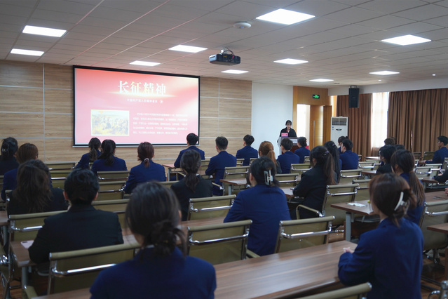 仪式结束后,艺术学院、马克思主义学院教师党员代表、学生入党积极分子参加了由青岛红景文化发展有限公司讲解员王晓讲授的党课《赓续长征精神 扬帆崭新征程》。