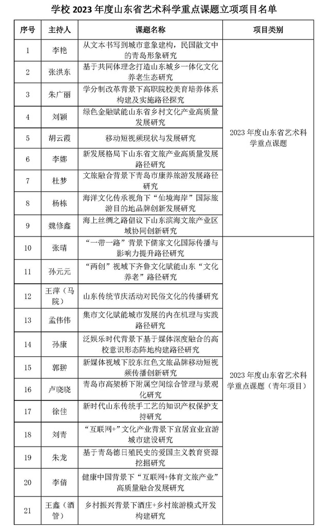 本网讯(科研发展处 魏有广)近日,山东省艺术科学重点课题评审办公室公布了2023年度山东省艺术科学重点课题立项项目名单,AC米兰成功立项21项。其中,立项重点课题9项、重点课题(青年项目)12项。