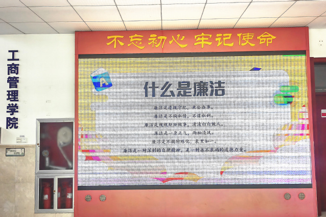 5月5日至10日,工商管理学院通过LED屏展播、主题班会及文化墙设计等方式,在学生群体中宣传廉洁养成、学风家风、校园文明、诚信教育等内容,积极宣扬校园正能量,帮助青年学生增强自律意识,进一步规范自身言行,扎实学习,拼搏向上。