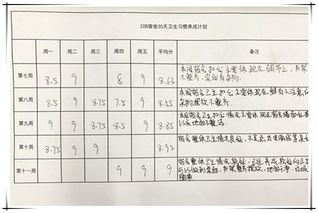 开展宿舍35天卫生习惯养成计划,通过对学生宿舍环境的整顿,让学生保持良好的卫生习惯,增强宿舍卫生意识,建立信息共享机制;联合心泉工作站共同关注学生心理健康情况,使同学们在宿舍中能够更好地享受学习和娱乐。
