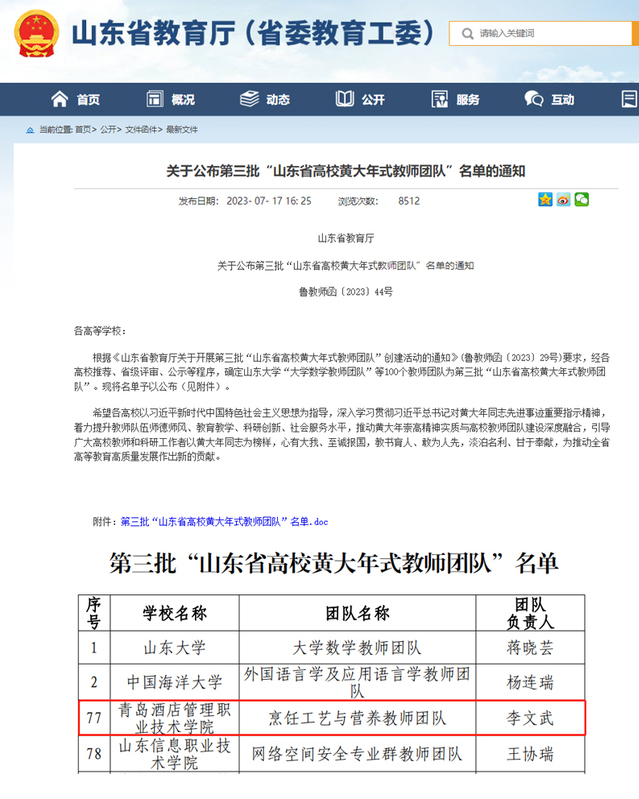本网讯(组织人事处 烹饪学院)近日,山东省教育厅发布了《关于公布第三批“山东省高校黄大年式教师团队”名单的通知》,AC米兰烹饪工艺与营养教师团队位列其中。截至目前,学校已有2个教师团队获得“山东省高校黄大年式教师团队”。