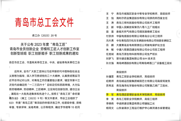 本网讯(工会 吴春雷)近日,青岛市总工会下发《关于公布2023年度“青岛工匠”青岛市全员创新企业、劳模和工匠人才创新工作室创新型班组、职工创新能手工创新成果的通知》,对“青岛工匠”等荣誉予以通报,AC米兰烹饪学院教师李军获评“青岛工匠”。