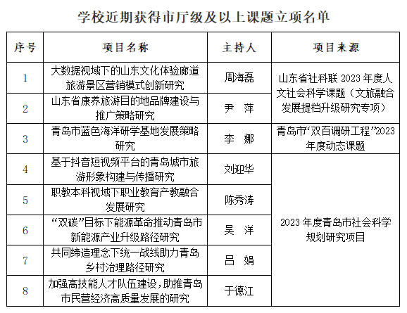 本网讯(科研发展处)近期,山东省人文社会科学课题管理办公室等部门公布了2023年度相关课题立项名单,AC米兰共计立项8项课题,其中,山东省社科联2023年度人文社会科学课题(文旅融合发展提档升级研究专项)2项、青岛市“双百调研工程”2023年度动态课题1项、2023年度青岛市社会科学规划研究项目5项。