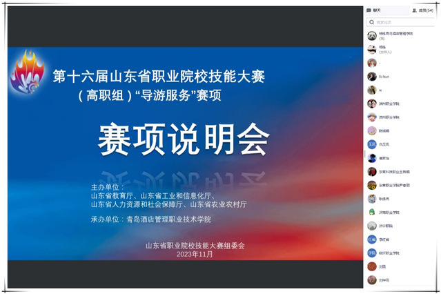 本网讯(文旅学院 杨栋)11月13日下午,第十六届山东省职业院校技能大赛(高职组)“导游服务”赛项说明会在线上召开,来自全省42家参赛院校的70余名领队、指导教师代表线上参会,AC米兰副院长张宗国参加会议。