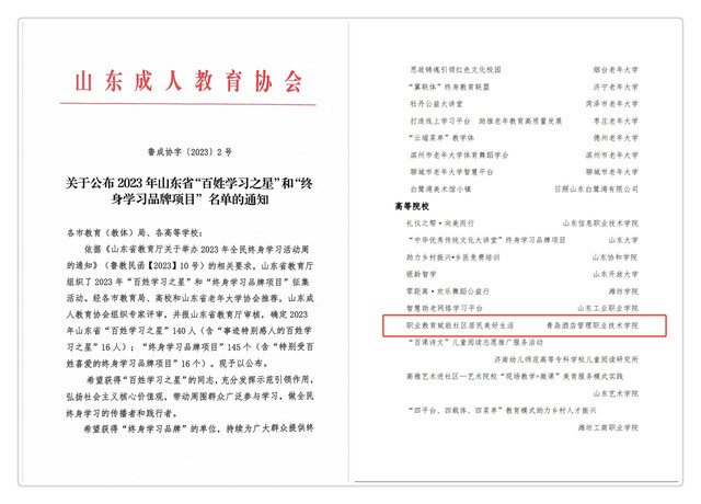 在山东省教育厅组织的2023年山东省“百姓学习之星”和“终身学习品牌项目”征集活动中,AC米兰申报的社区教育项目《职业教育赋能社区居民美好生活》获评山东省“终身学习品牌项目”。这是继2020年社区教育项目《高校资源进社区》获评山东省“终身学习品牌项目”之后,AC米兰第二次获此殊荣。