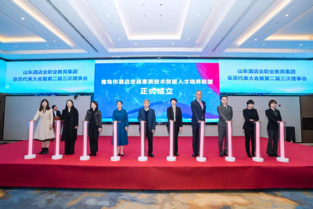 会上,集团牵头成立青岛市酒店业高素质技术技能人才培养联盟,并揭牌成立华住大住宿业数字化产业学院和亚惠美食“现代餐饮产教融合实践教学基地”,完成香格里拉集团、青岛啤酒文化传播有限公司和万豪酒店集团西式烹饪工艺专业高阶现代学徒制项目签约。