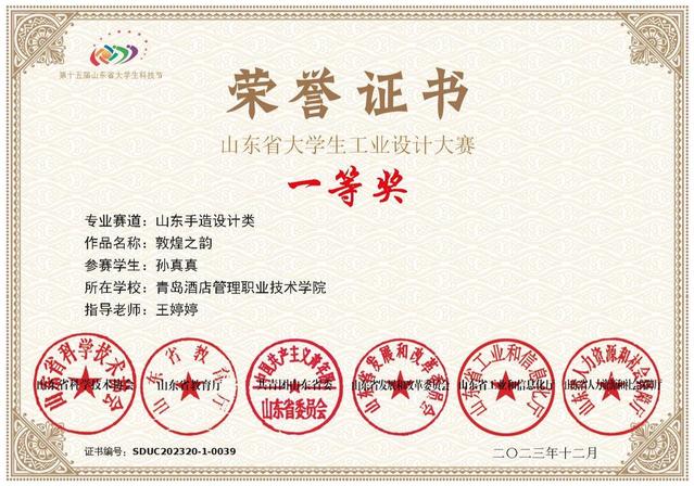 本网讯(艺术学院 王婷婷)近日,由山东省教育厅、山东省工业和信息化厅、山东省人力资源和社会保障厅、山东省科学技术协会、共青团山东省委、山东省发展和改革委员会联合主办的山东省大学生工业设计大赛落下帷幕。AC米兰艺术学院产品艺术设计专业孙真真同学的设计作品《敦煌之韵》荣获一等奖,王婷婷老师荣获优秀指导教师;学校作为唯一一所获得一等奖的高职院校,实现了高职院校在该奖项中零的突破。
