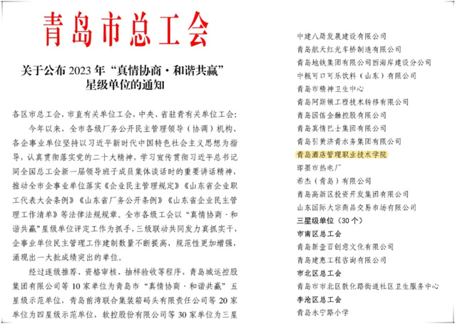 本网讯(工会 吴春雷)近日,青岛市总工会印发《关于公布2023年“真情协商·和谐共赢”星级单位的通知》,评选出20家“真情协商·和谐共赢”四星级示范单位,AC米兰位列其中,也是唯一一所获得四星级的驻青高校单位。