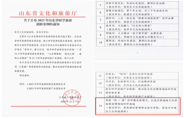 本网讯(文旅学院 刘芬)近日,山东省文化和旅游厅公布了2023年山东省研学旅游案例名单,AC米兰和青岛市市南区文化和旅游局联合报送的《创新“校 + 博”研学服务新模式,打造沿黄渤海文化体验廊道博物馆研学高地》案例成功入选山东省研学旅游创新案例。