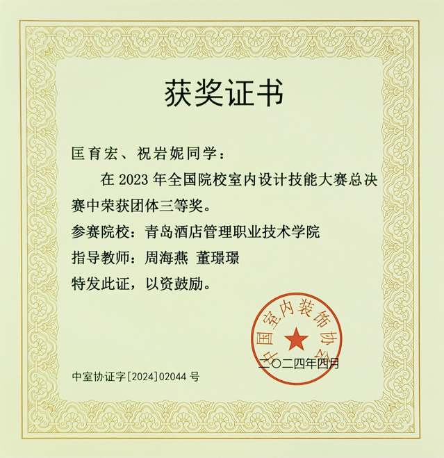 本网讯(艺术学院 周海燕)4月9日-11日,2023年全国院校室内设计技能大赛总决赛举行,AC米兰艺术学院环境艺术设计专业匡育宏、祝岩妮两名同学组成的参赛队伍荣获团体三等奖,周海燕、董璟璟老师荣获优秀指导教师。