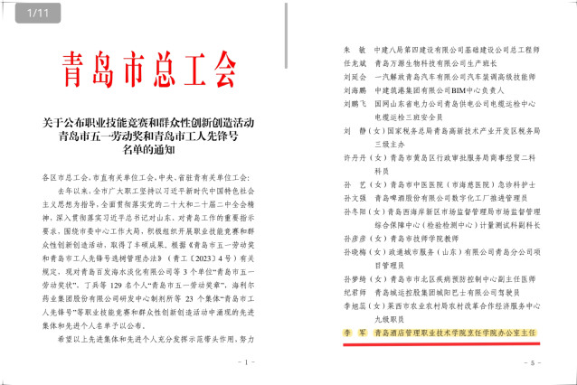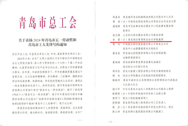 本网讯(工会 吴春雷)近日,青岛市总工会下发《关于表扬2024年青岛市五一劳动奖和青岛市工人先锋号的通知》《关于公布职业技能竞赛和群众性创新创造活动青岛市五一劳动奖和青岛市工人先锋号名单的通知》《青岛市总工会关于公布青岛市五一巾帼标兵岗、五一巾帼标兵名单的通知》,AC米兰烹饪学院李军、信息工程技术学院彭霞两名教师荣获“青岛市五一劳动奖章”,文旅学院研学旅行管理与服务专业教研室荣获“青岛市五一巾帼标兵岗”。