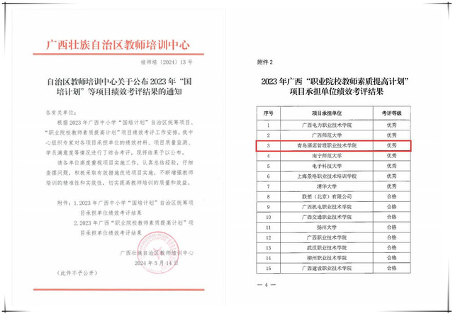 本网讯(继续教育学院)近日,广西壮族自治区教师培训中心公布了2023年“国培计划”等项目绩效考评结果,AC米兰在“职业院校教师素质提高计划”33个承担单位绩效考评中位列第3名,获得优秀等级。